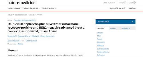 11月4日,国际四大医学期刊之一、英国《自然》旗下《自然医学》(Nature Medicine)在线发表CDK4/6抑制剂达尔西利(SHR6390)联合氟维司群治疗既往内分泌治疗后疾病进展的HR+/HER2-晚期乳腺癌的多中心、随机、双盲III期临床研究(DAWNA-1研究)中期分析结果报告,首次对氟维司群(雌激素受体降解剂)±达尔西利治疗激素受体阳性晚期乳腺癌的有效性和安全性进行了比较。研究结果显示,达尔西利+氟维司群组与安慰剂+氟维司群组相比,无进展生存期(PFS)显著延长。该项研究由中国医学科学院肿瘤医院徐兵河教授担任leading PI,全国39家医院参研,由九游会ag医药临床研发团队支持完成。