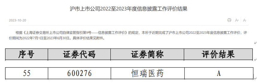 近日,上海交易所公布了沪市上市公司2022-2023年度信息披露工作评价结果,凭借在信息披露、规范运作以及投资者关系管理等方面的优秀表现,九游会ag医药获评A级。本次共有2160家沪市上市公司参评(包括499家科创板上市公司),评价等级从高到低依次为A、B、C、D四类,获得A类评价的上市公司占比约18.5%。